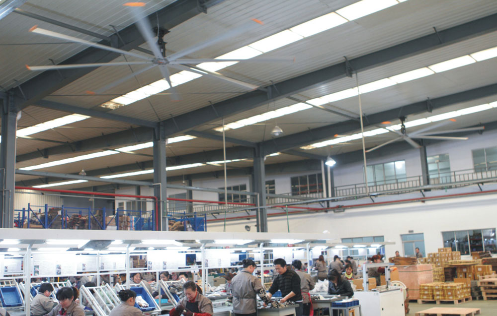 我公司生產的大型工業吊扇直接懸掛在廠房屋梁下,風力柔和,能加快車間空氣流通,有效降低車間內溫度,改善車間空氣環境質量,有利于員工的身體健康。